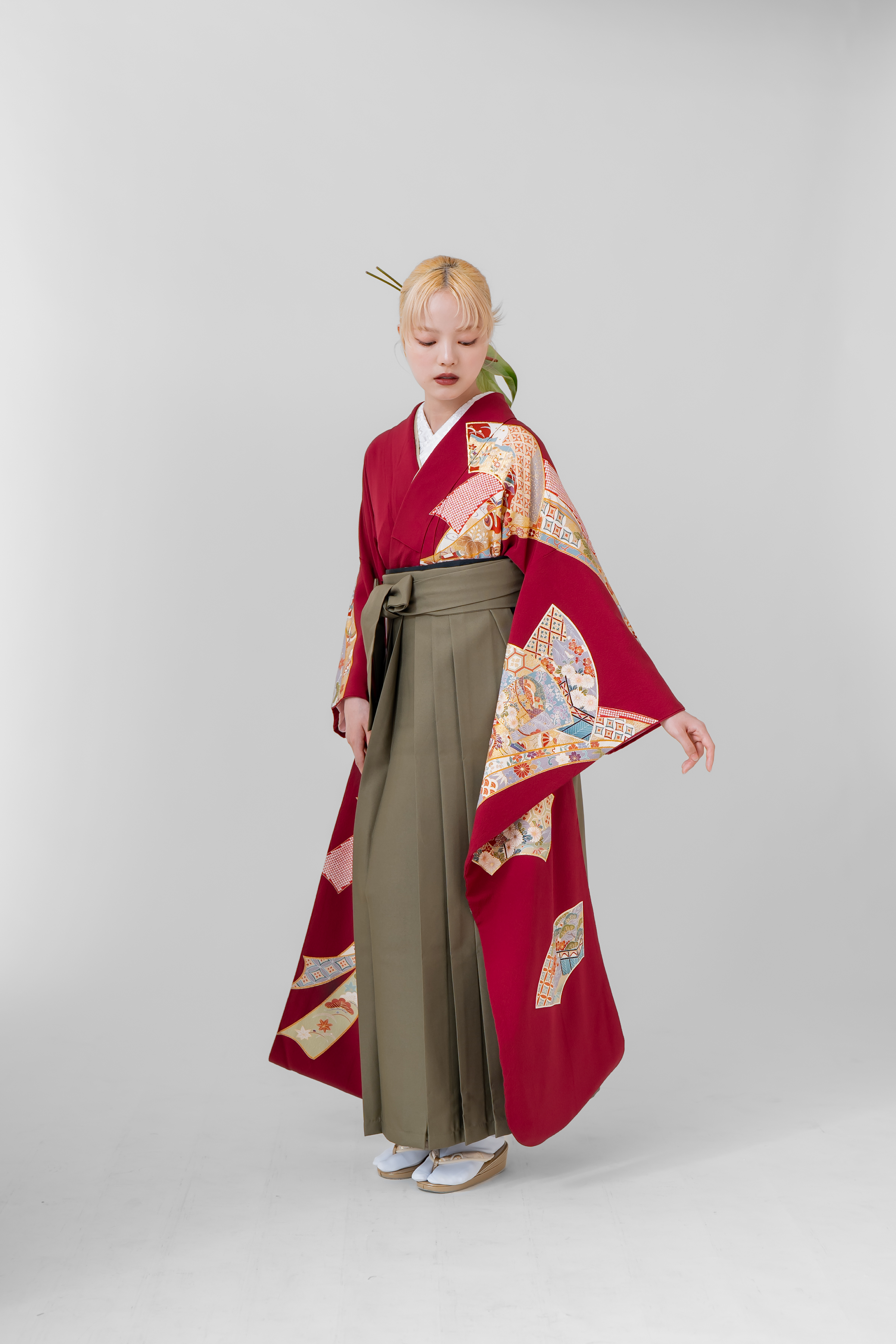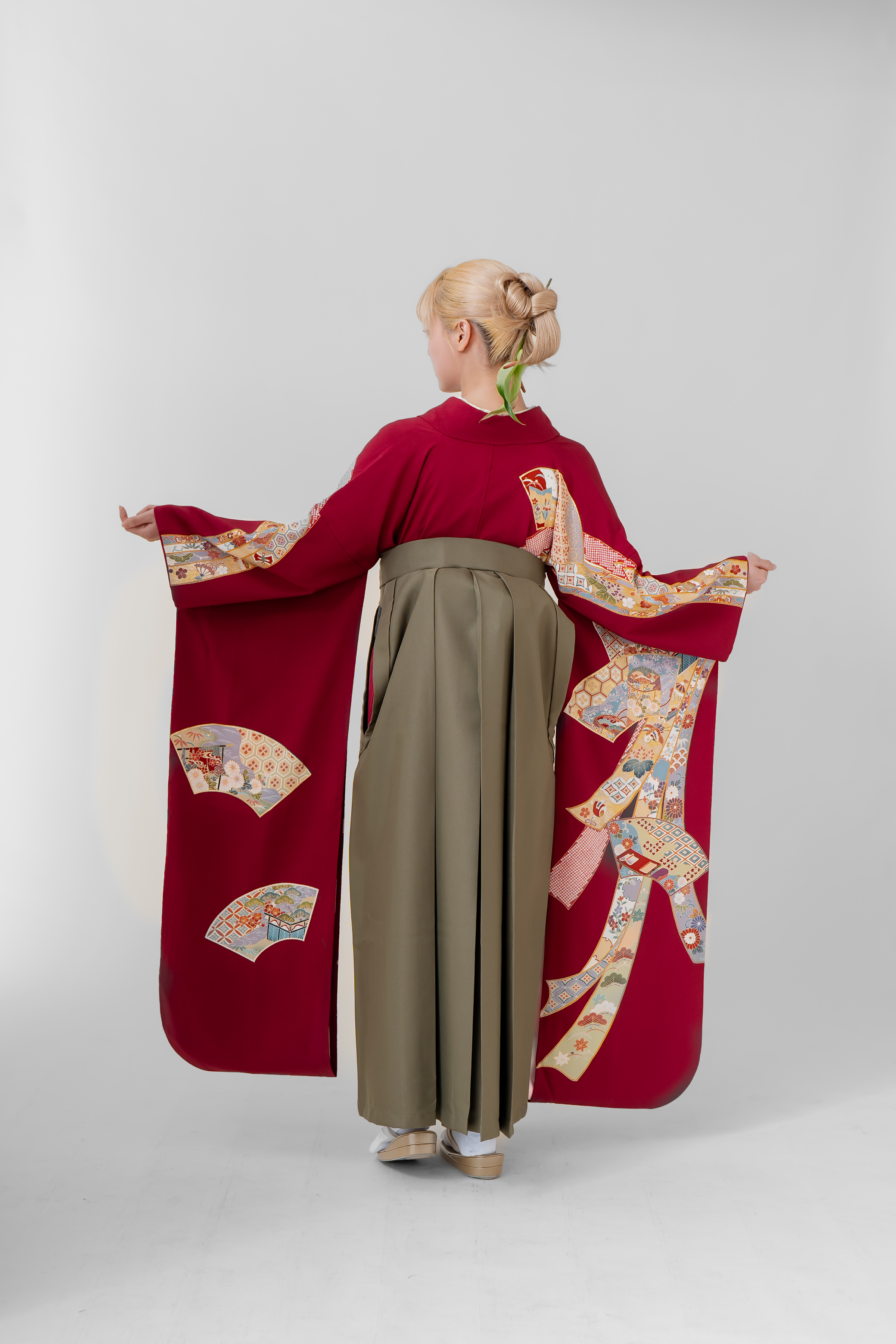 ■袴0005 真紅に扇熨斗 袴:抹茶